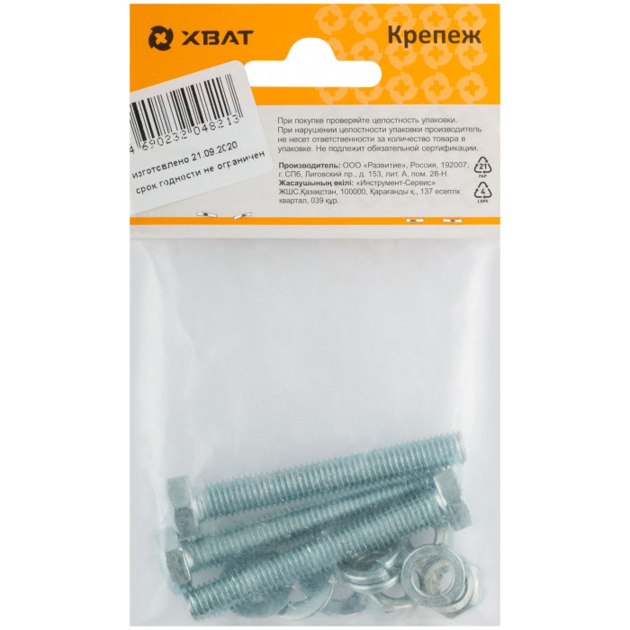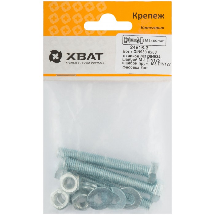 Комплект:Болт DIN933 8х60, с гайкой М8 DIN934, шайбой М 8 DIN125, шайбой пруж. М8 DIN127 (фасовка 3шт.) (24816-3)