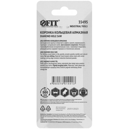 Для вырезания круговых отверстий в керамограните, мраморе, натуральном камне, граните, кафеле. Влажное сверление. Материал: инструментальная сталь с никелевым покрытием, режущая кромка содержит порошок из технических алмазов. Упаковка: блистер.