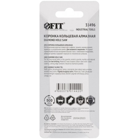 Для вырезания круговых отверстий в керамограните, мраморе, натуральном камне, граните, кафеле. Влажное сверление. Материал: инструментальная сталь с никелевым покрытием, режущая кромка содержит порошок из технических алмазов. Упаковка: блистер.