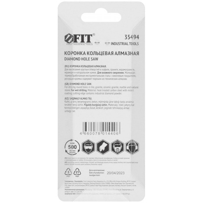 Для вырезания круговых отверстий в керамограните, мраморе, натуральном камне, граните, кафеле. Влажное сверление. Материал: инструментальная сталь с никелевым покрытием, режущая кромка содержит порошок из технических алмазов. Упаковка: блистер.