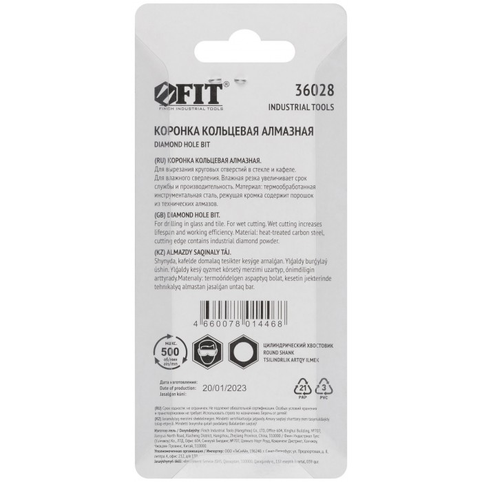 Для вырезания круговых отверстий в стекле и кафеле. Влажное сверление. Материал: хромированная стальная основа, алмазное напыление режущих кромок. Упаковка: блистер.