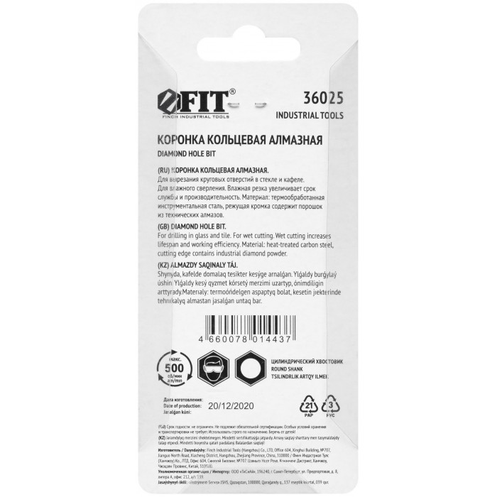 Для вырезания круговых отверстий в стекле и кафеле. Влажное сверление. Материал: хромированная стальная основа, алмазное напыление режущих кромок. Упаковка: блистер.