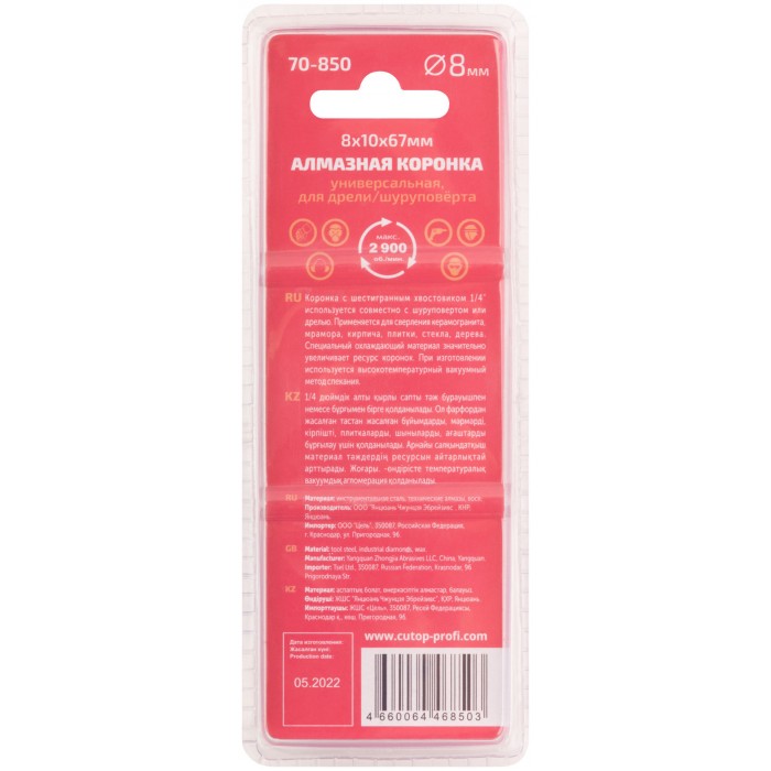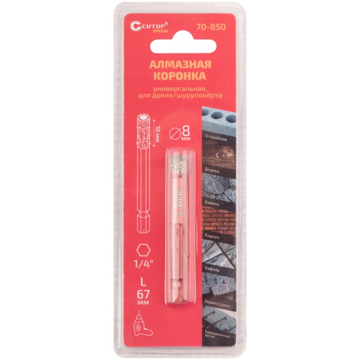 Коронка алмазная универсальная CUTOP Special, шестигранный хвостовик 1/4", 8 x 10 х 67 мм (70-850)