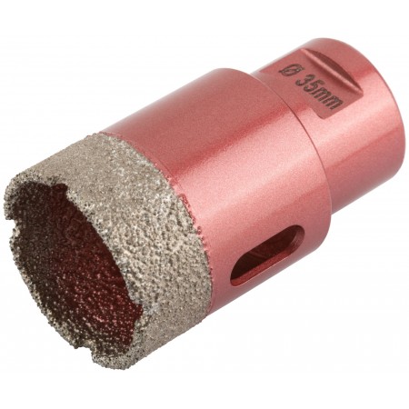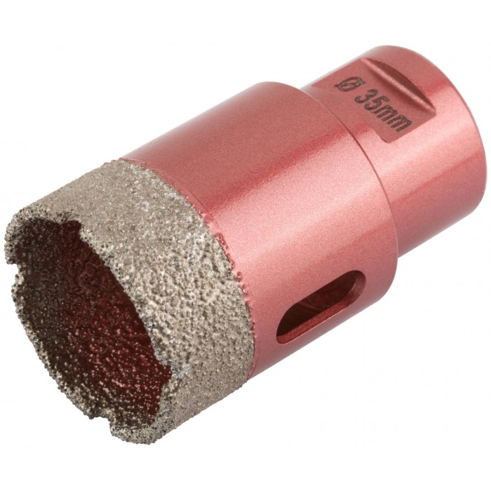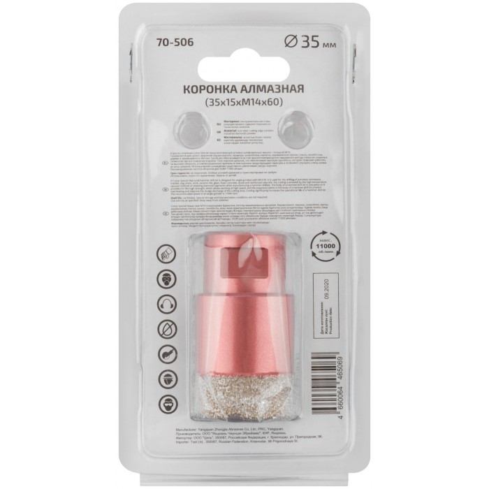 Коронка алмазная Cutop Special предназначена для УШМ с посадкой М14. Применяется для сухого сверления: керамогранита, мрамора, шлакоблока, кирпича, керамической плитки, стекла, пенобетона, дерева и армированного бетона. Сухой рез обеспечивается за счет высокотемпературного вакуумного метода спекания алмазных сегментов при изготовлении коронки. Тело коронки цельное, что обеспечивает высокую прочность, которая позволяет работать на самых высоких оборотах. Использование охлаждения существенно увеличивает ресурс коронки. В коронках диаметром 25-68 мм имеются компенсационные пропилы, которые предотвращают перегрев и позволяют улучшать отвод шлама из зоны резания. Материал: Инструментальная сталь, технические алмазы. Упаковка: блистер.