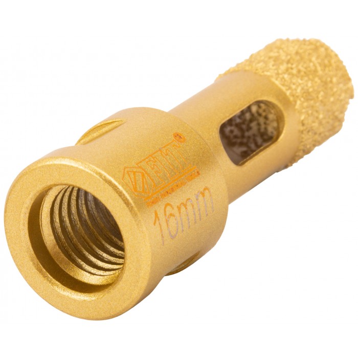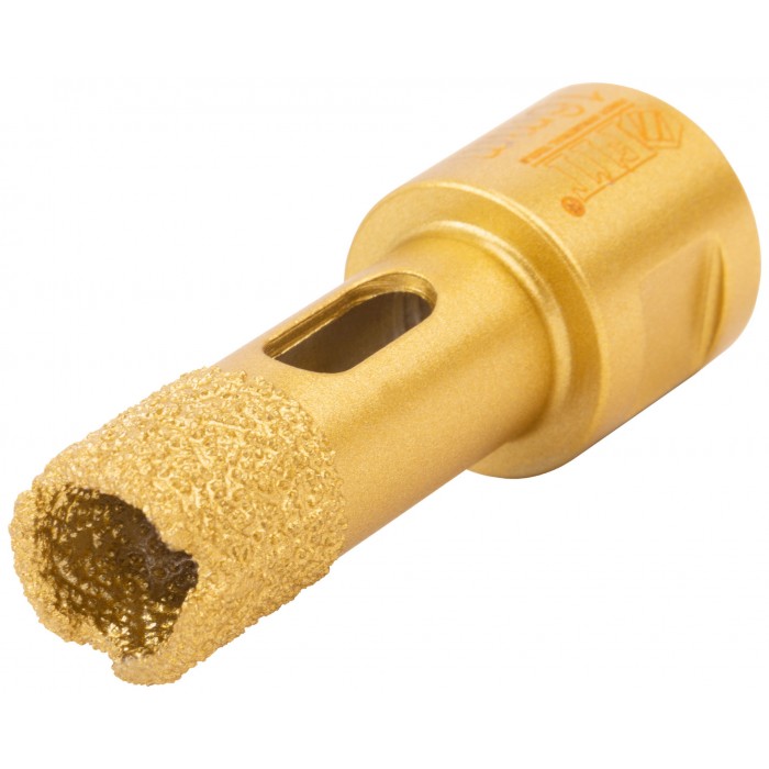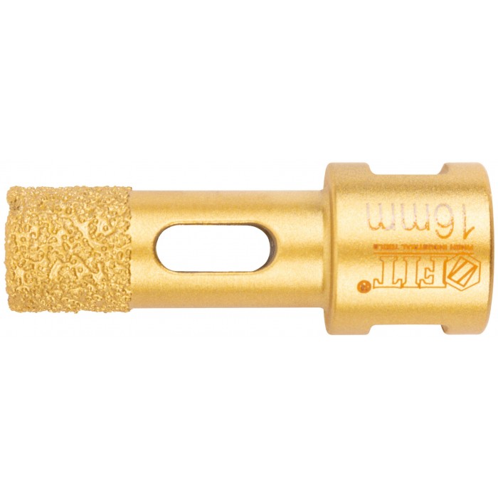 Профи. Хвостовик М14. Для вырезания круговых отверстий в керамограните, кафельной плитке, бетоне, граните, мраморе, кирпиче, стекле. Сухое и влажное сверление. Глубина пропила 40 мм. Для углошлифовальных машин. Технология вакуумного спекания обеспечивает большую твердость и более длительный срок службы коронки. Внутри коронок 16332-16334 находится воск для охлаждения при работе. Материал: инструментальная сталь, режущая кромка содержит порошок из технических алмазов. Упаковка: пластиковая туба.