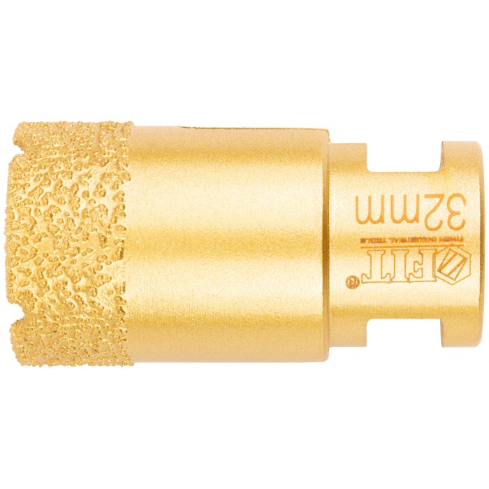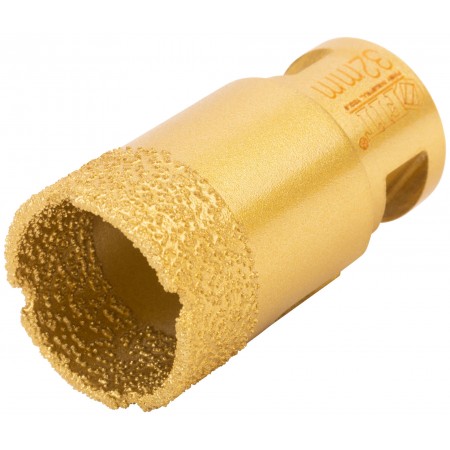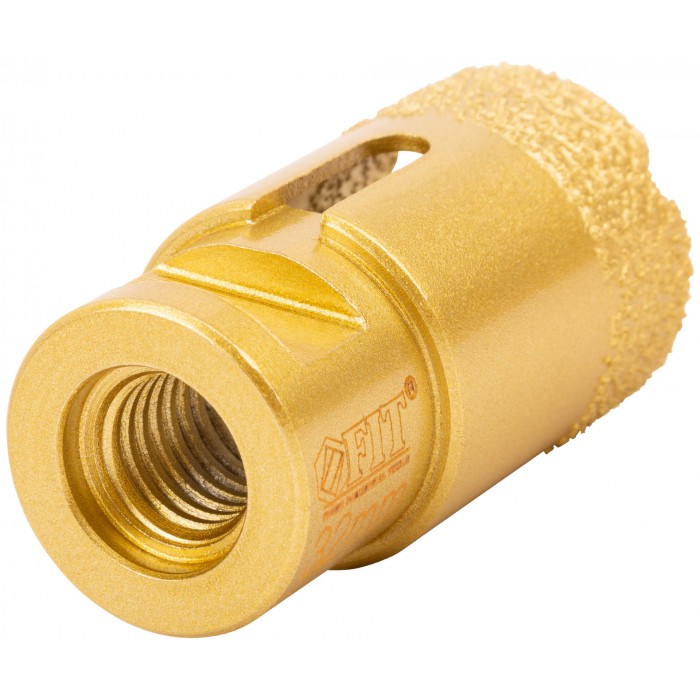 Профи. Хвостовик М14. Для вырезания круговых отверстий в керамограните, кафельной плитке, бетоне, граните, мраморе, кирпиче, стекле. Сухое и влажное сверление. Глубина пропила 40 мм. Для углошлифовальных машин. Технология вакуумного спекания обеспечивает большую твердость и более длительный срок службы коронки. Внутри коронок 16332-16334 находится воск для охлаждения при работе. Материал: инструментальная сталь, режущая кромка содержит порошок из технических алмазов. Упаковка: пластиковая туба.
