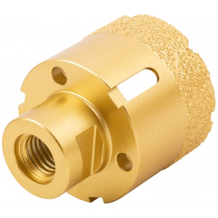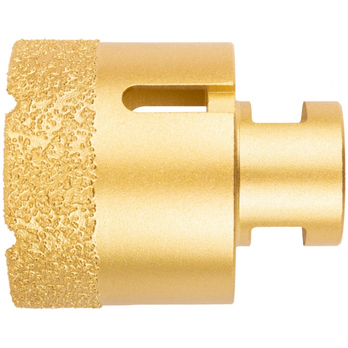 Профи. Хвостовик М14. Для вырезания круговых отверстий в керамограните, кафельной плитке, бетоне, граните, мраморе, кирпиче, стекле. Сухое и влажное сверление. Глубина пропила 40 мм. Для углошлифовальных машин. Технология вакуумного спекания обеспечивает большую твердость и более длительный срок службы коронки. Внутри коронок 16332-16334 находится воск для охлаждения при работе. Материал: инструментальная сталь, режущая кромка содержит порошок из технических алмазов. Упаковка: пластиковая туба.