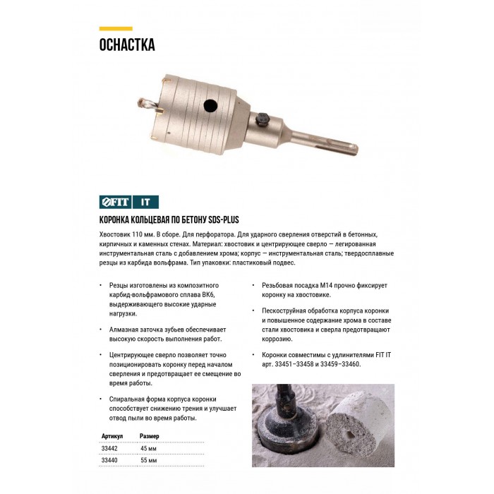 Коронка кольцевая по бетону, хвостовик 110 мм в сборе, 45 мм (33442)