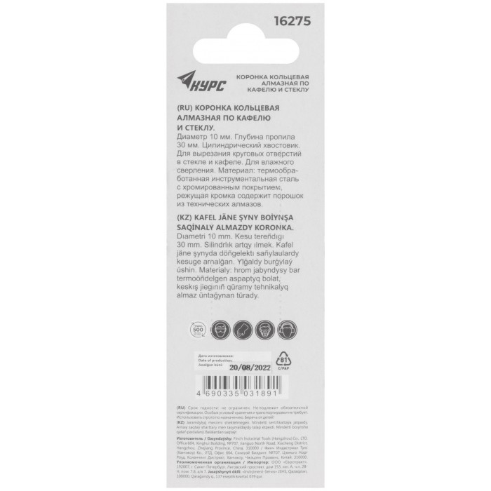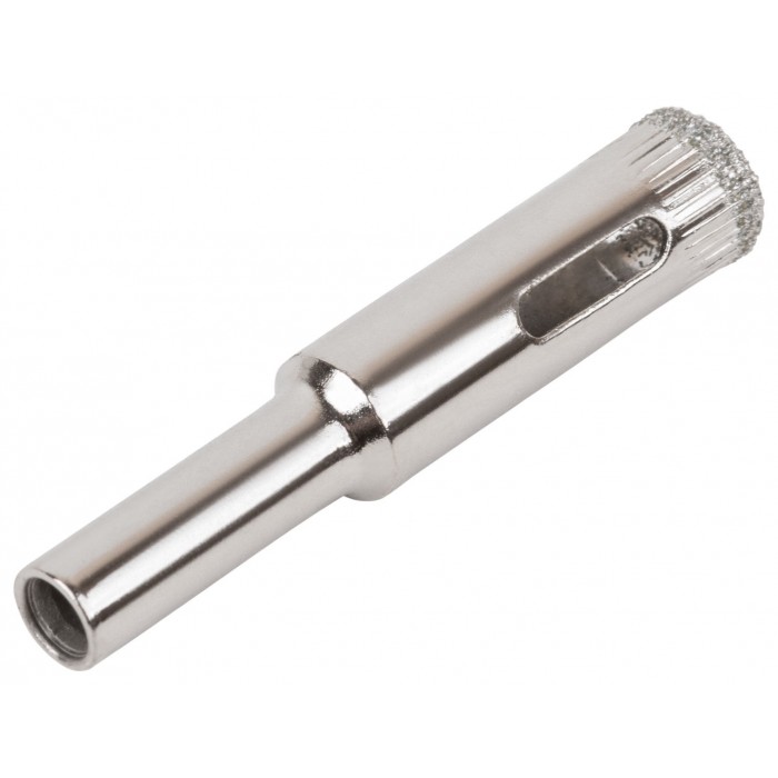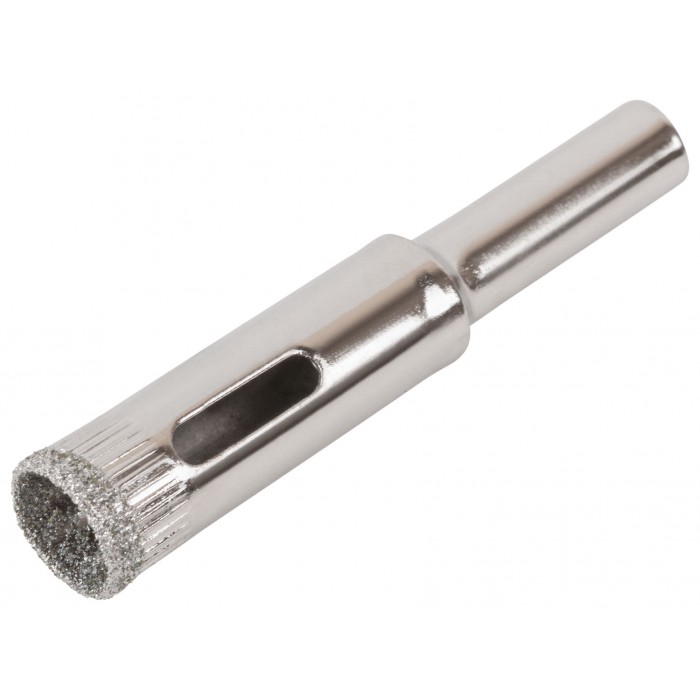 Цилиндрический хвостовик. Для вырезания круговых отверстий в кафеле и стекле. Влажное сверление. Глубина пропила 30 мм. Материал: инструментальная сталь, режущая кромка содержит порошок из технических алмазов. Упаковка: блистер.
