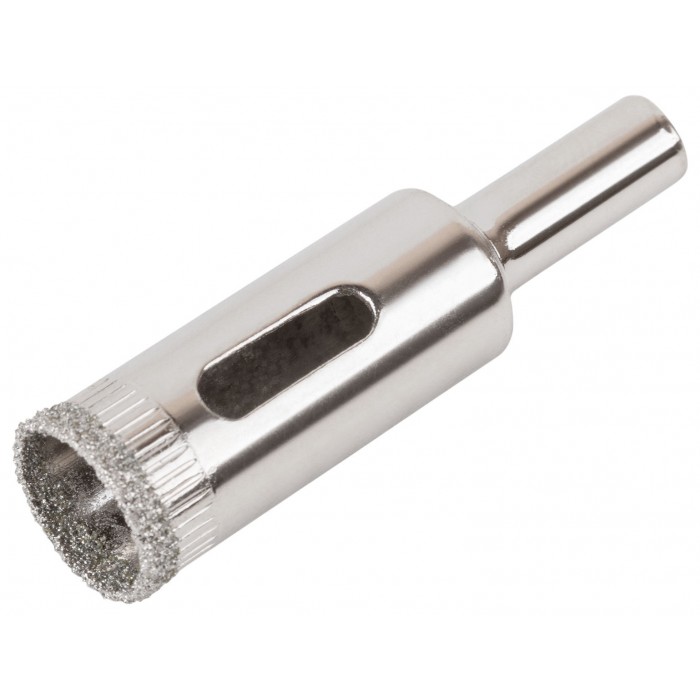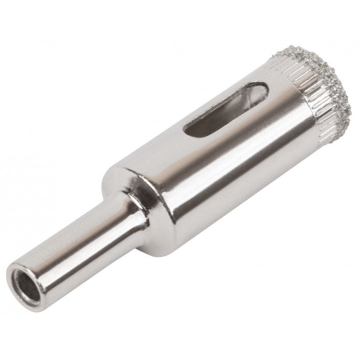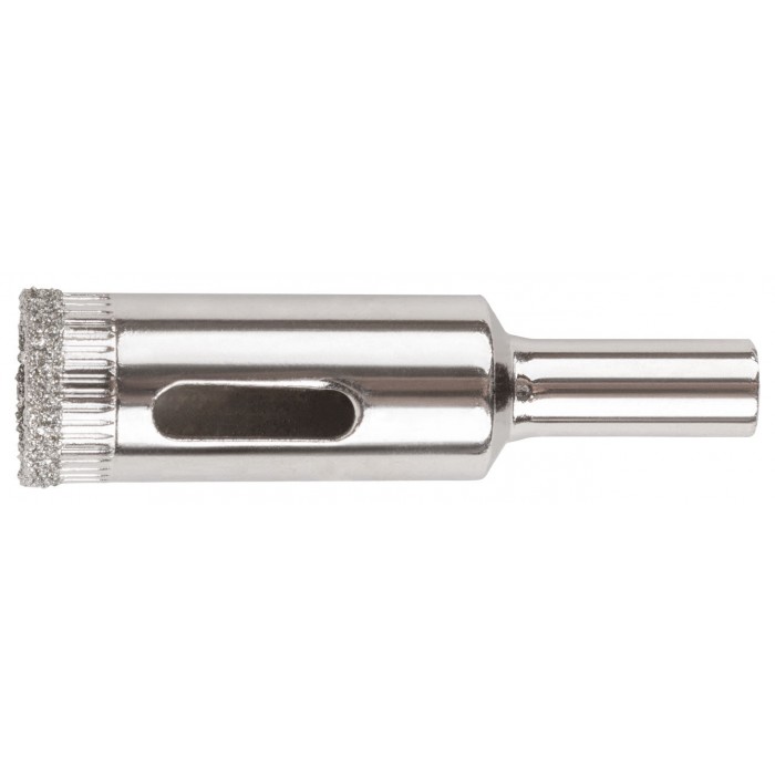 Цилиндрический хвостовик. Для вырезания круговых отверстий в кафеле и стекле. Влажное сверление. Глубина пропила 30 мм. Материал: инструментальная сталь, режущая кромка содержит порошок из технических алмазов. Упаковка: блистер.