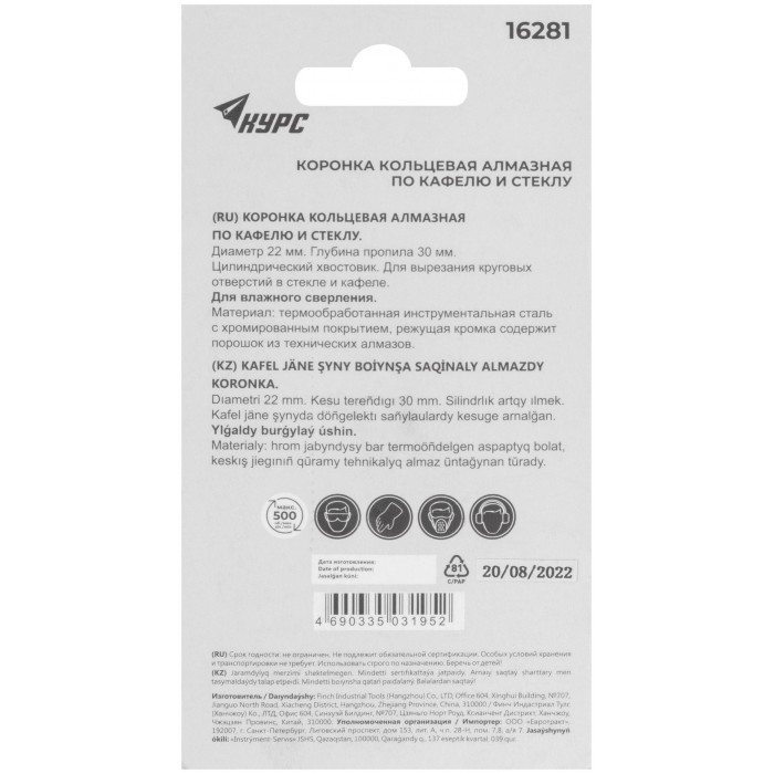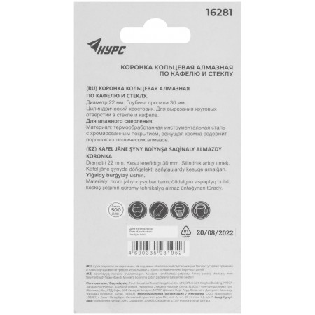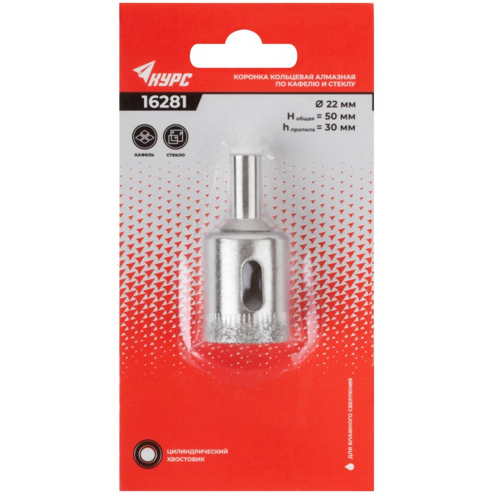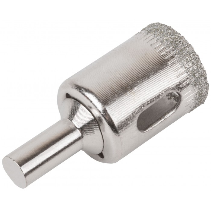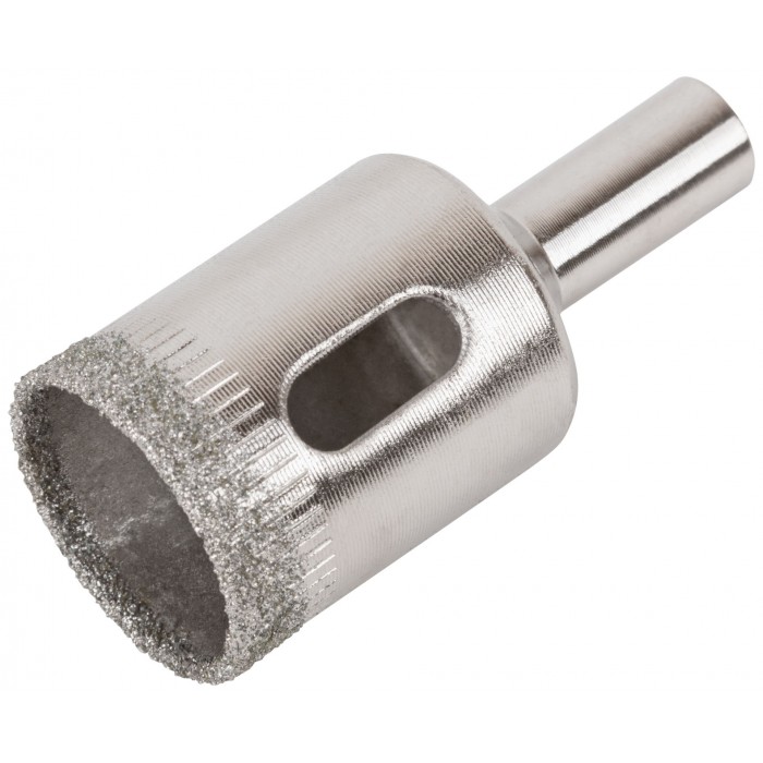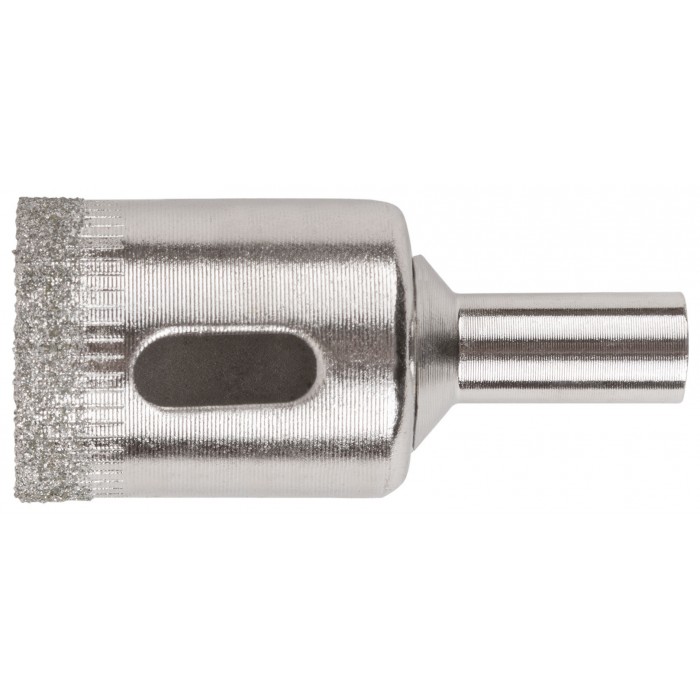 Цилиндрический хвостовик. Для вырезания круговых отверстий в кафеле и стекле. Влажное сверление. Глубина пропила 30 мм. Материал: инструментальная сталь, режущая кромка содержит порошок из технических алмазов. Упаковка: блистер.