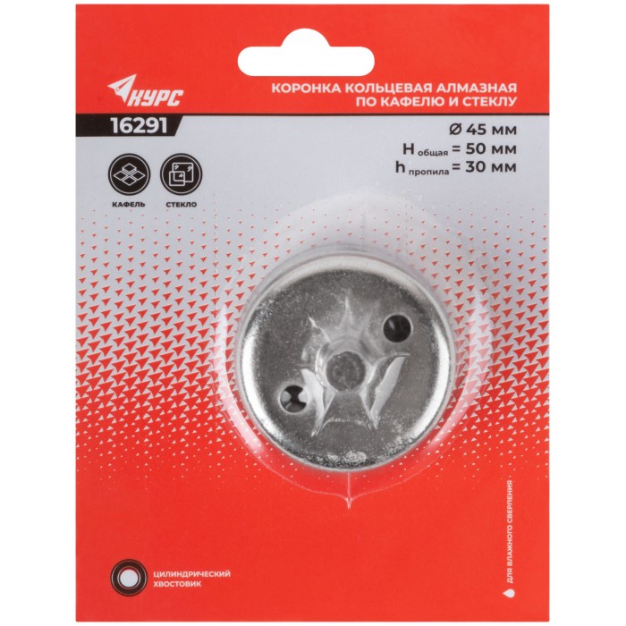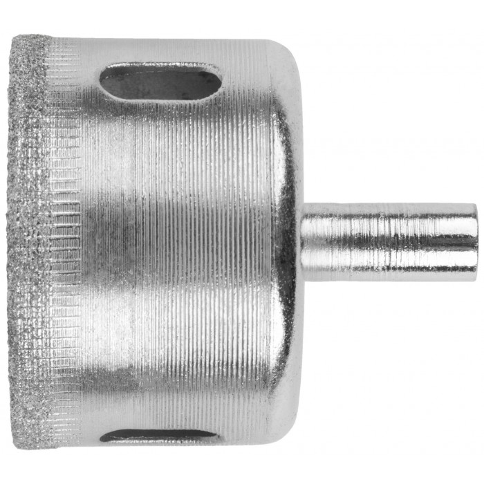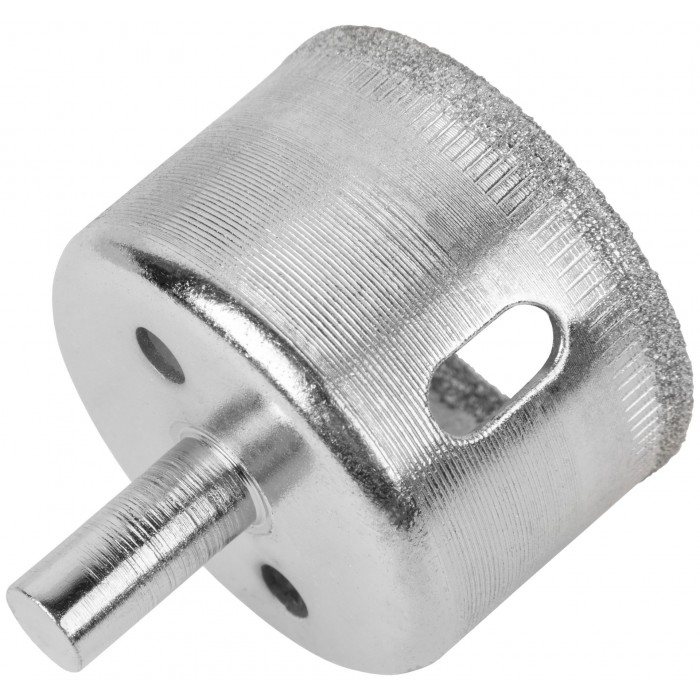 Цилиндрический хвостовик. Для вырезания круговых отверстий в кафеле и стекле. Влажное сверление. Глубина пропила 30 мм. Материал: инструментальная сталь, режущая кромка содержит порошок из технических алмазов. Упаковка: блистер.