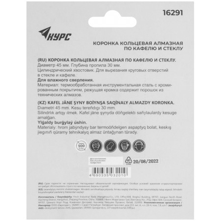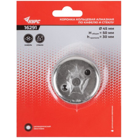 Коронка кольцевая по кафелю и стеклу алмазная 45х50 мм (16291)