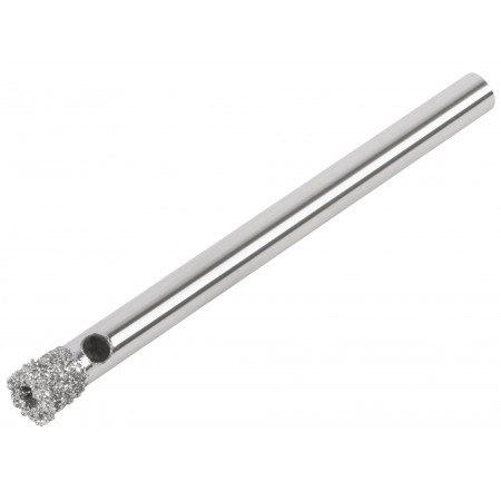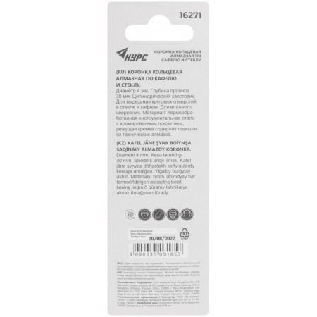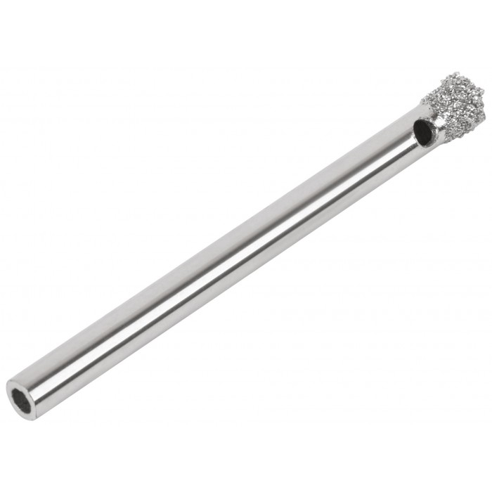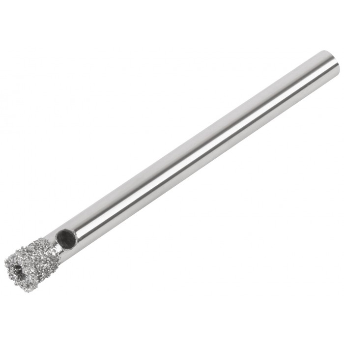 Цилиндрический хвостовик. Для вырезания круговых отверстий в кафеле и стекле. Влажное сверление. Глубина пропила 30 мм. Материал: инструментальная сталь, режущая кромка содержит порошок из технических алмазов. Упаковка: блистер.