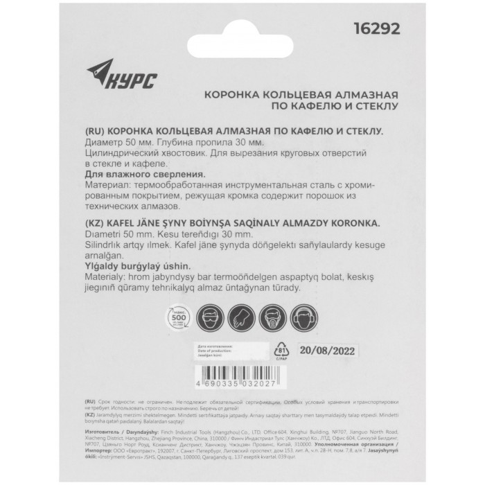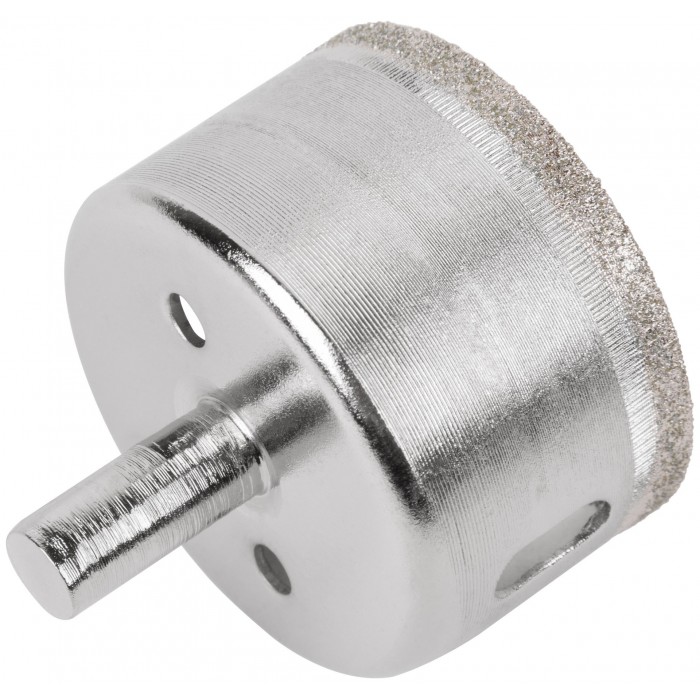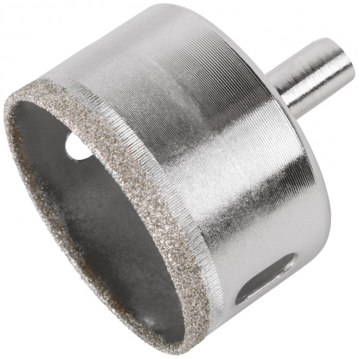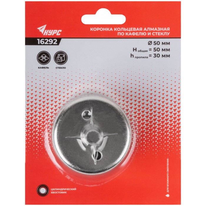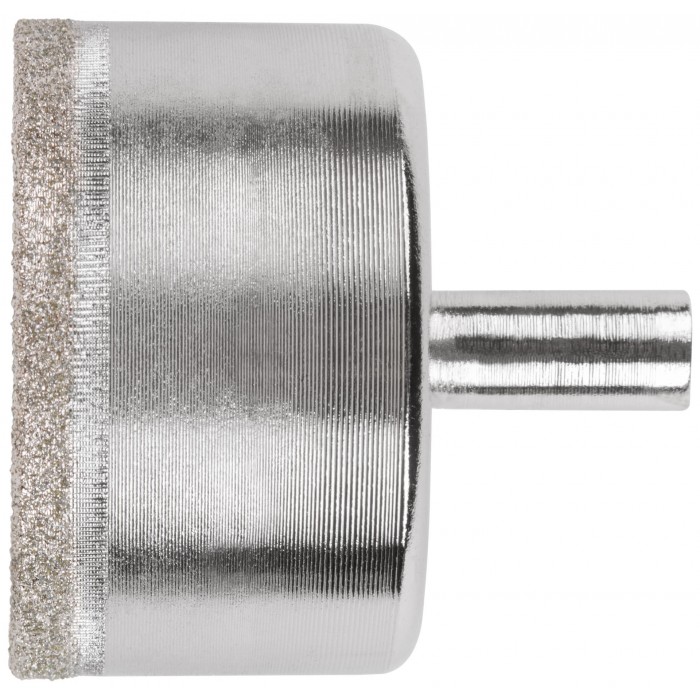 Цилиндрический хвостовик. Для вырезания круговых отверстий в кафеле и стекле. Влажное сверление. Глубина пропила 30 мм. Материал: инструментальная сталь, режущая кромка содержит порошок из технических алмазов. Упаковка: блистер.