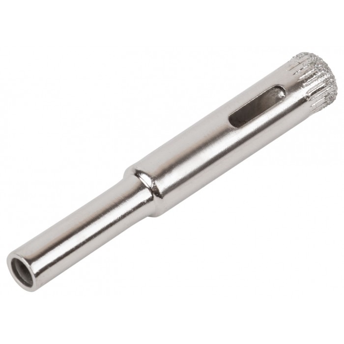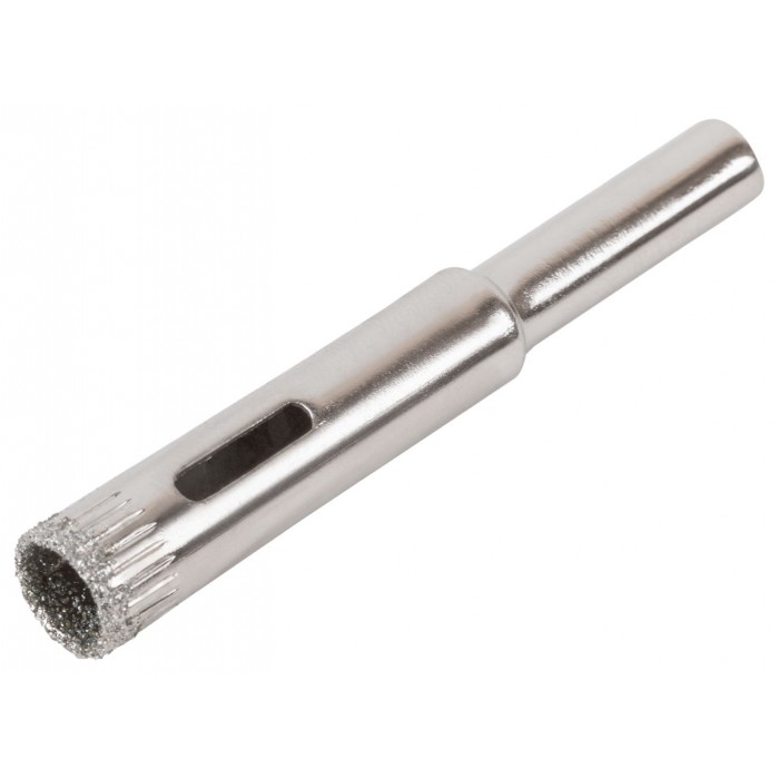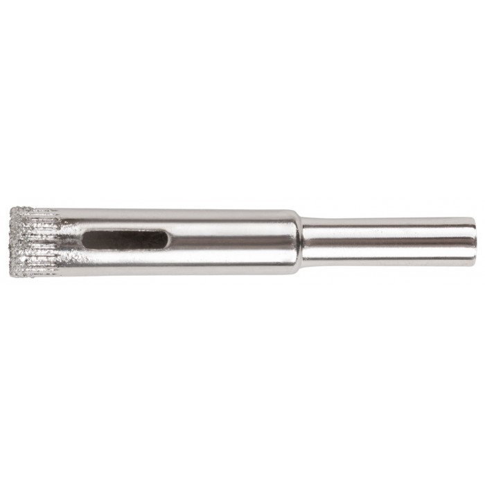 Цилиндрический хвостовик. Для вырезания круговых отверстий в кафеле и стекле. Влажное сверление. Глубина пропила 30 мм. Материал: инструментальная сталь, режущая кромка содержит порошок из технических алмазов. Упаковка: блистер.
