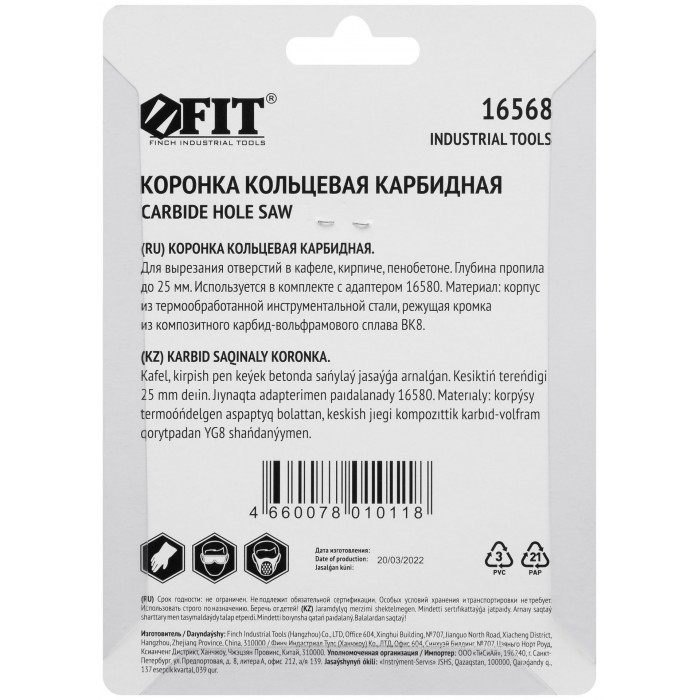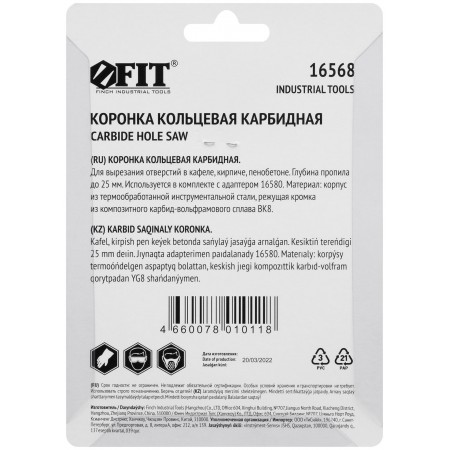 Для вырезания отверстий в кафеле, кирпиче и пористом бетоне. Глубина пропила до 25 мм. Используются в комплекте с адаптером 16579 или 16580. Материал: инструментальная сталь, режущая кромка из твердосплавного карбид-вольфрамового сплава ВК8. Упаковка: блистер.