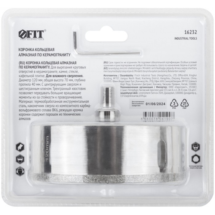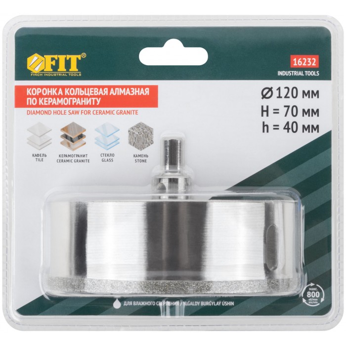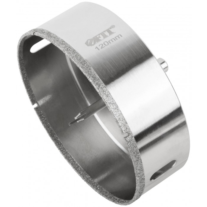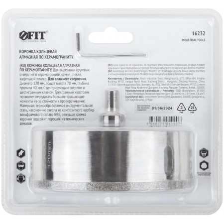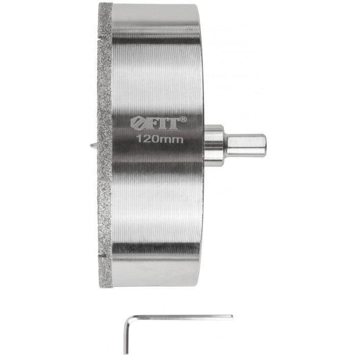 Трехгранный хвостовик. Идут в комплекте с центрирующим сверлом и шестигранным ключом. Для вырезания круговых отверстий в керамограните, камне, стекле, кафельной плитке. Влажное сверление. Глубина пропила 40 мм. Материал: инструментальная сталь, режущая кромка содержит порошок из технических алмазов. Упаковка: блистер.