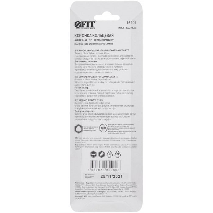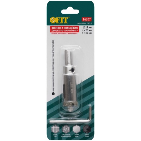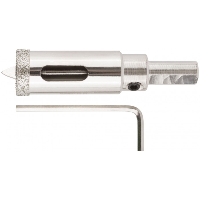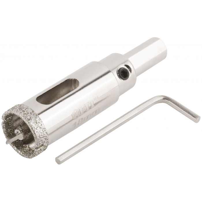 Трехгранный хвостовик. Идут в комплекте с центрирующим сверлом и шестигранным ключом. Для вырезания круговых отверстий в керамограните, камне, стекле, кафельной плитке. Влажное сверление. Глубина пропила 40 мм. Материал: инструментальная сталь, режущая кромка содержит порошок из технических алмазов. Упаковка: блистер.
