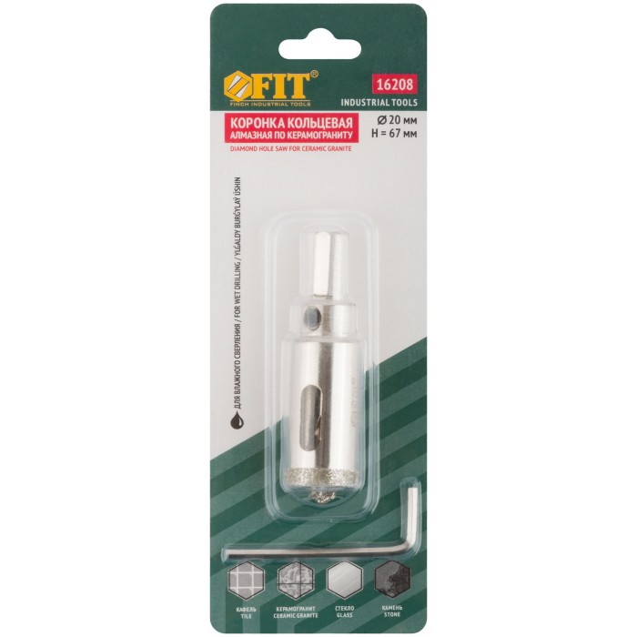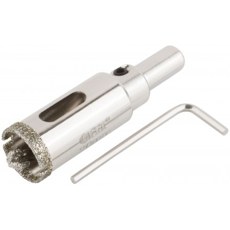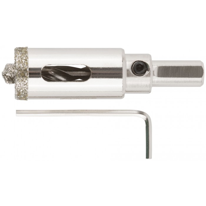 Трехгранный хвостовик. Идут в комплекте с центрирующим сверлом и шестигранным ключом. Для вырезания круговых отверстий в керамограните, камне, стекле, кафельной плитке. Влажное сверление. Глубина пропила 40 мм. Материал: инструментальная сталь, режущая кромка содержит порошок из технических алмазов. Упаковка: блистер.