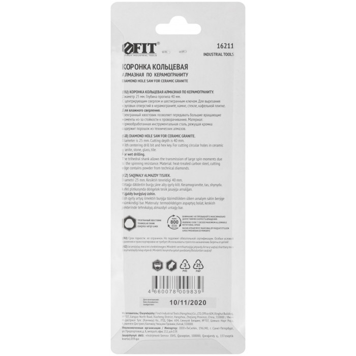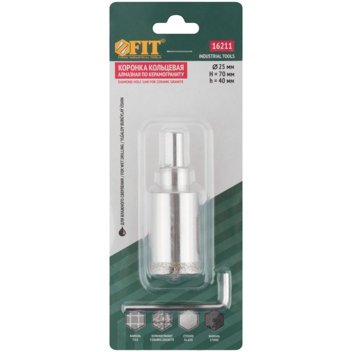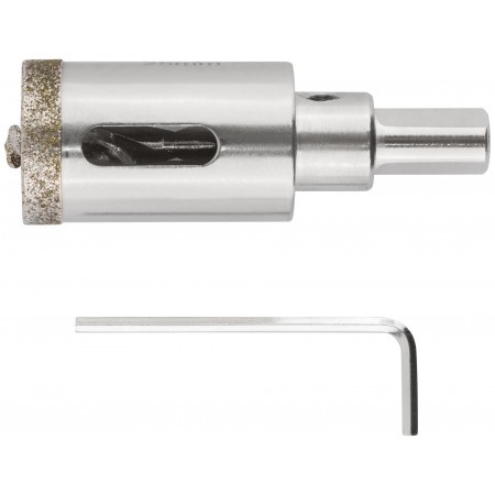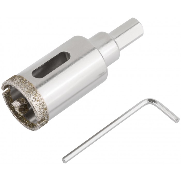 Трехгранный хвостовик. Идут в комплекте с центрирующим сверлом и шестигранным ключом. Для вырезания круговых отверстий в керамограните, камне, стекле, кафельной плитке. Влажное сверление. Глубина пропила 40 мм. Материал: инструментальная сталь, режущая кромка содержит порошок из технических алмазов. Упаковка: блистер.