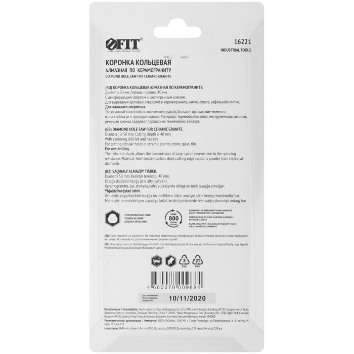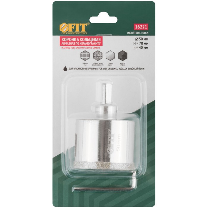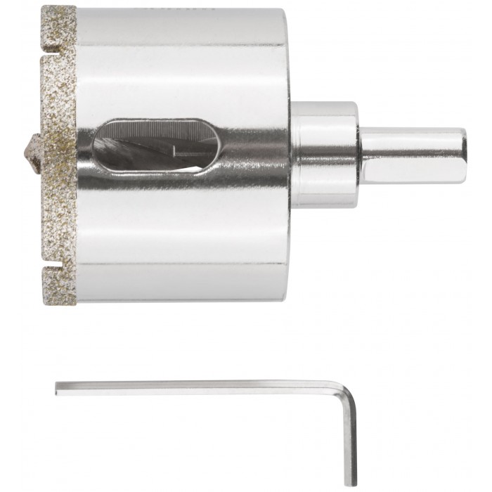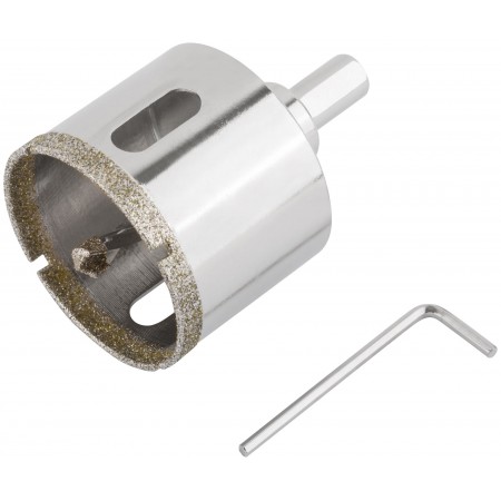 Трехгранный хвостовик. Идут в комплекте с центрирующим сверлом и шестигранным ключом. Для вырезания круговых отверстий в керамограните, камне, стекле, кафельной плитке. Влажное сверление. Глубина пропила 40 мм. Материал: инструментальная сталь, режущая кромка содержит порошок из технических алмазов. Упаковка: блистер.