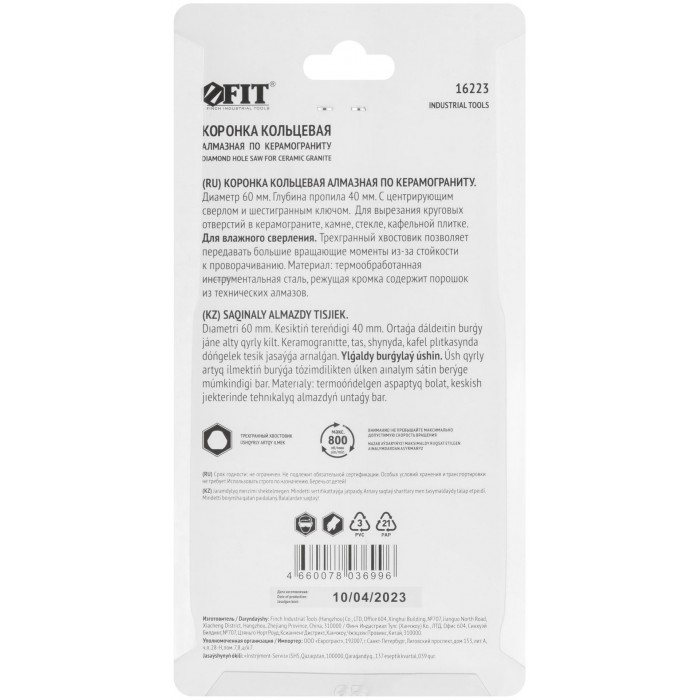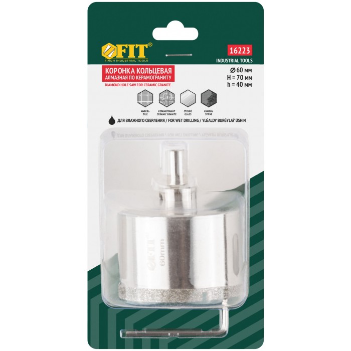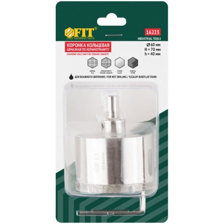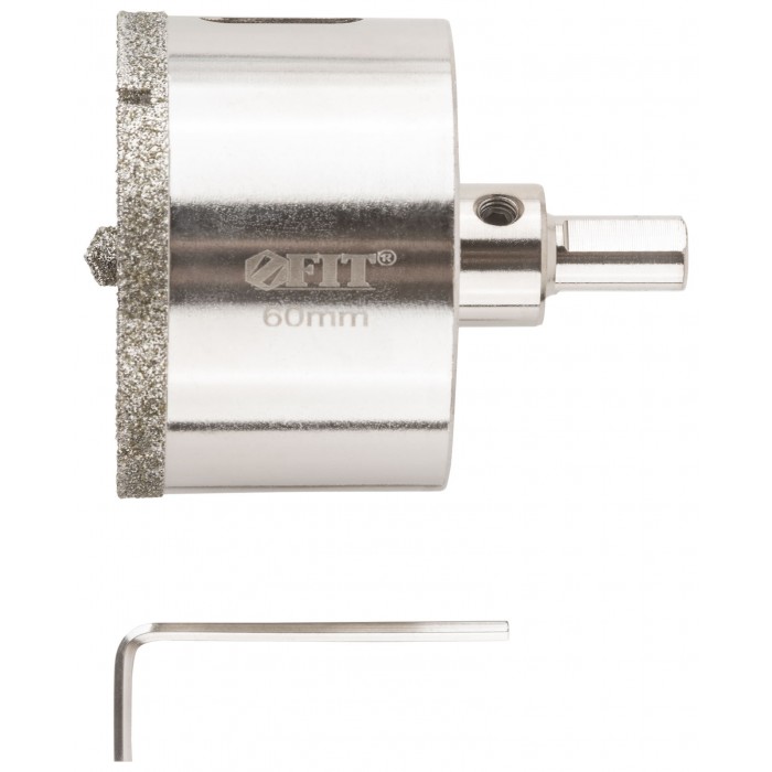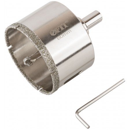 Трехгранный хвостовик. Идут в комплекте с центрирующим сверлом и шестигранным ключом. Для вырезания круговых отверстий в керамограните, камне, стекле, кафельной плитке. Влажное сверление. Глубина пропила 40 мм. Материал: инструментальная сталь, режущая кромка содержит порошок из технических алмазов. Упаковка: блистер.