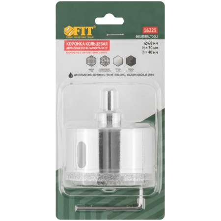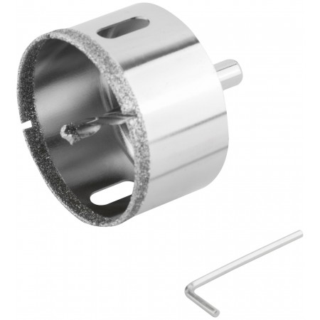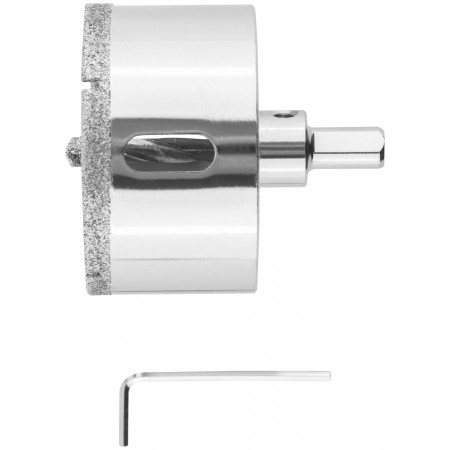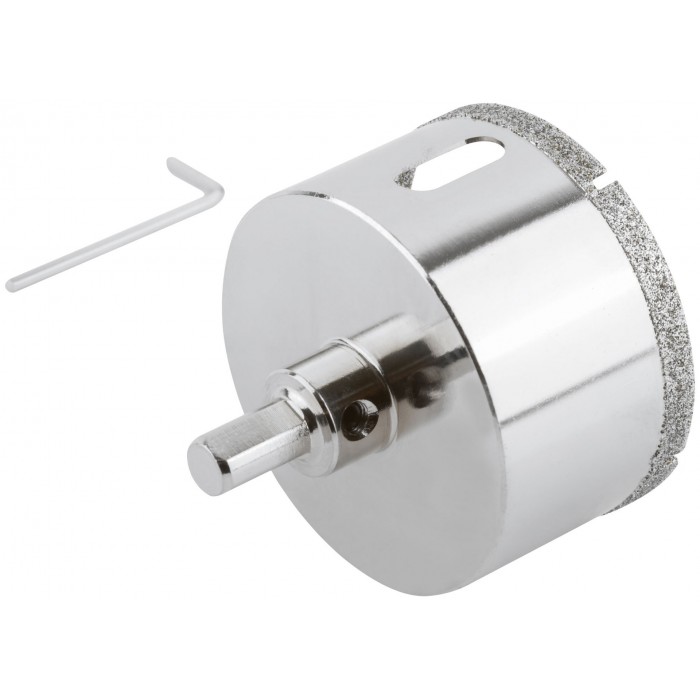 Трехгранный хвостовик. Идут в комплекте с центрирующим сверлом и шестигранным ключом. Для вырезания круговых отверстий в керамограните, камне, стекле, кафельной плитке. Влажное сверление. Глубина пропила 40 мм. Материал: инструментальная сталь, режущая кромка содержит порошок из технических алмазов. Упаковка: блистер.