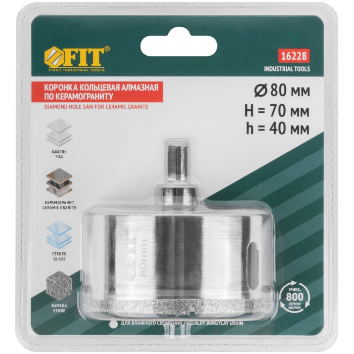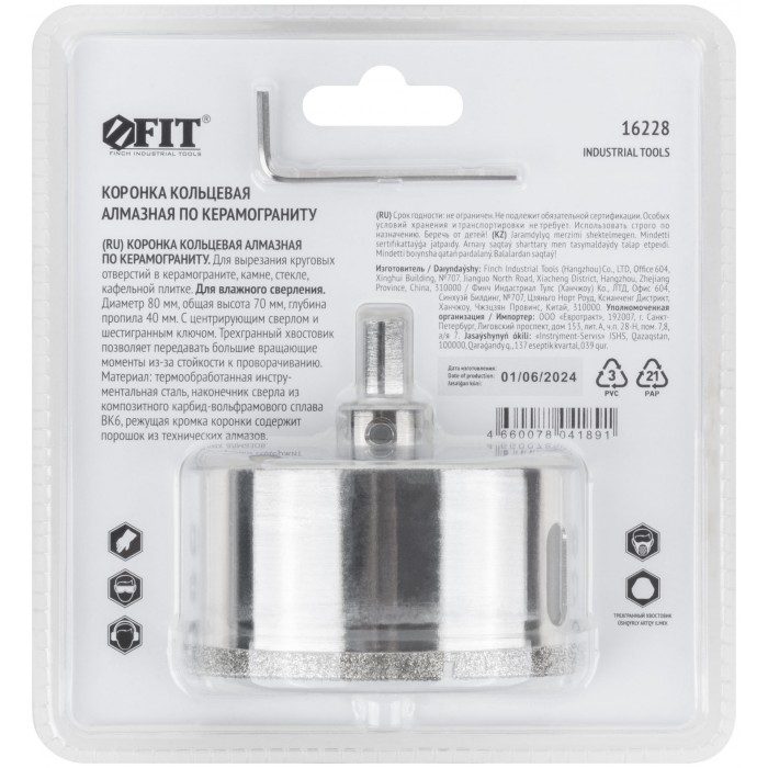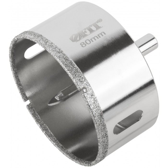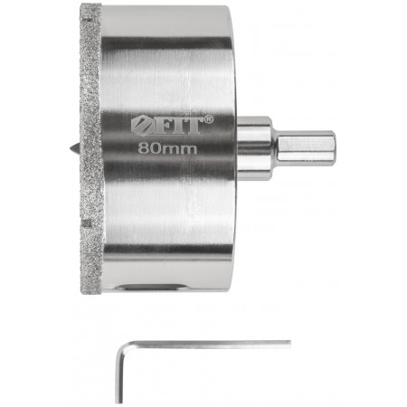 Трехгранный хвостовик. Идут в комплекте с центрирующим сверлом и шестигранным ключом. Для вырезания круговых отверстий в керамограните, камне, стекле, кафельной плитке. Влажное сверление. Глубина пропила 40 мм. Материал: инструментальная сталь, режущая кромка содержит порошок из технических алмазов. Упаковка: блистер.
