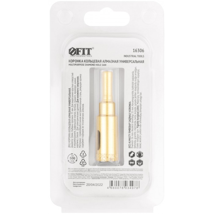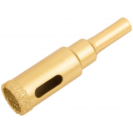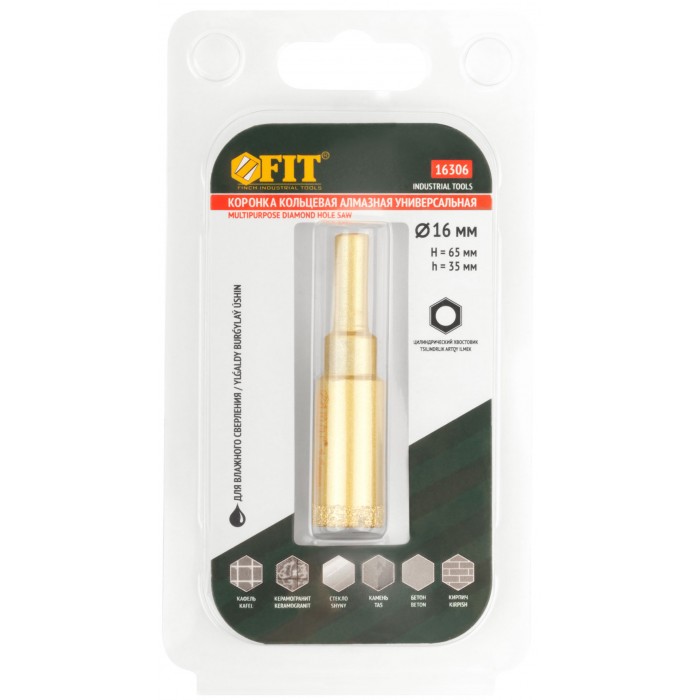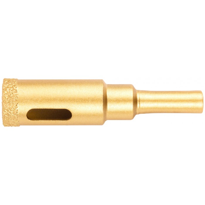 Профи. 16301-16306: цилиндрический хвостовик, 16308-16310: трехгранный хвостовик. Для вырезания круговых отверстий в керамограните, кафельной плитке, бетоне, граните, мраморе, камне, кирпиче и стекле. Влажное сверление. Глубина пропила 35 мм. Материал: инструментальная сталь, режущая кромка содержит порошок из технических алмазов. Упаковка: блистер.