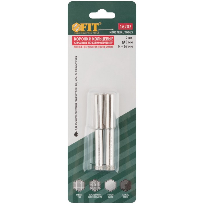 Коронки кольцевые по керамограниту, камню и кафелю алмазные, набор 2 шт., 8х65 мм (16202)