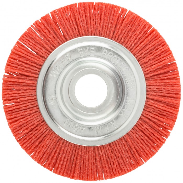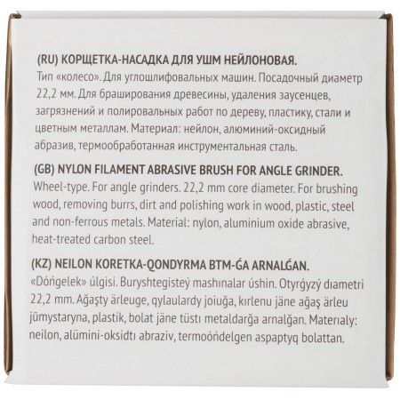 Тип «колесо». Нейлоновая. Для УШМ. Посадочный диаметр 22,2 мм. Для браширования древесины, удаления заусенцев, загрязнений и полировальных работ по дереву, пластику, стали и цветным металлам. Материал: нейлон, алюминий-оксидный абразив, основа из инструментальной стали. Упаковка: картонная коробка.