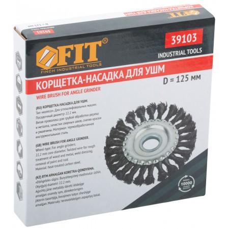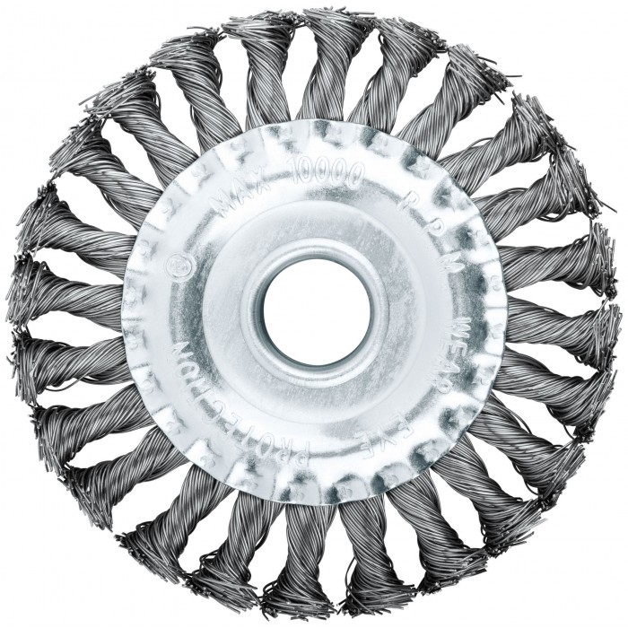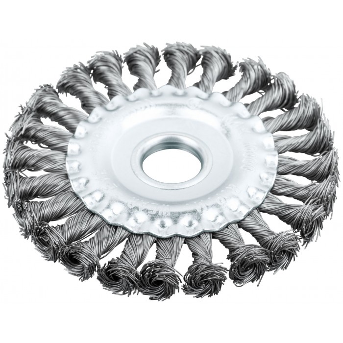 Тип «колесо». Для УШМ. Витая стальная проволока. Посадочный диаметр – 22,2 мм. Упаковка: картонная коробка.