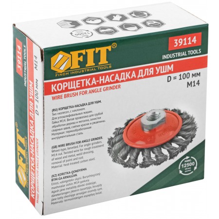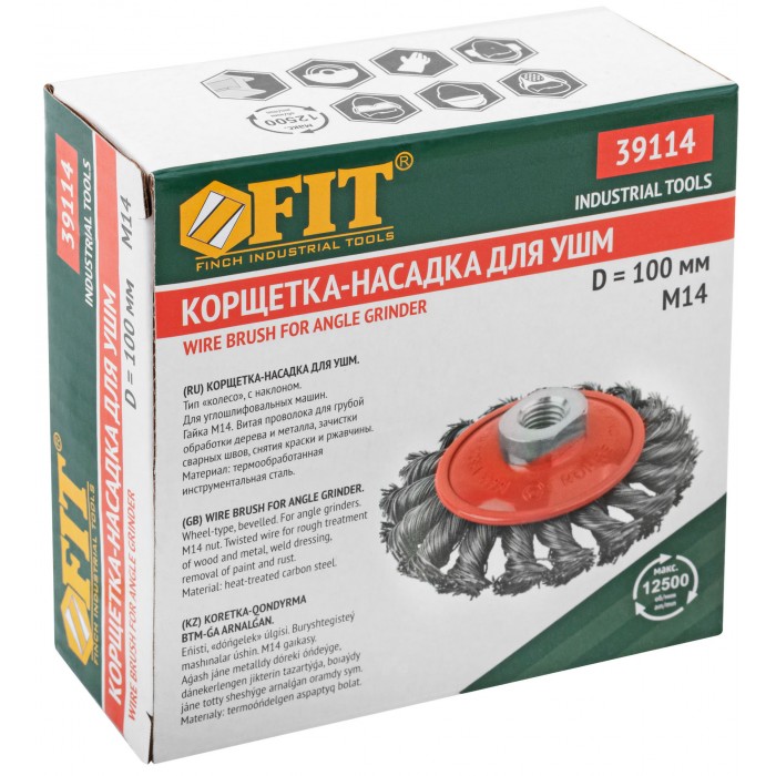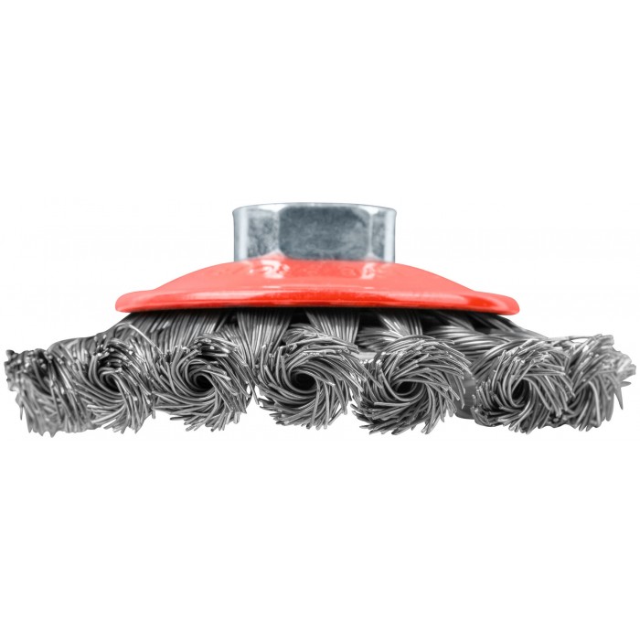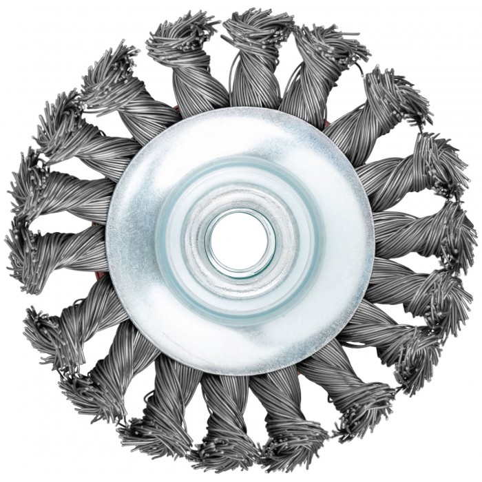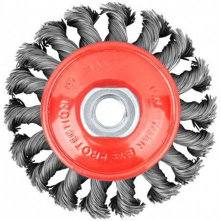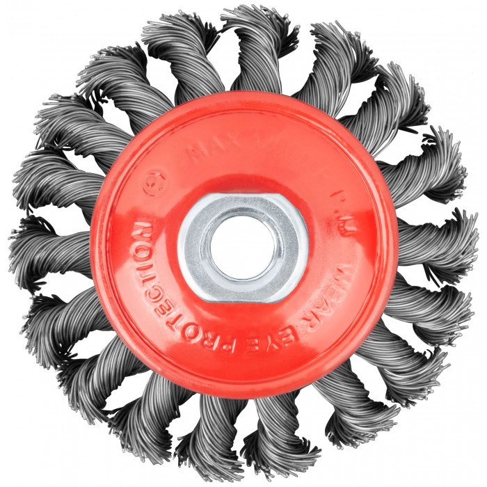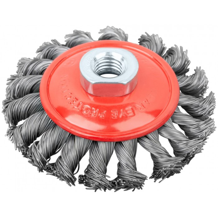 Тип «колесо», с наклоном, гайка М14. Для УШМ. Витая стальная проволока. Упаковка: картонная коробка.
