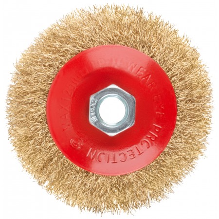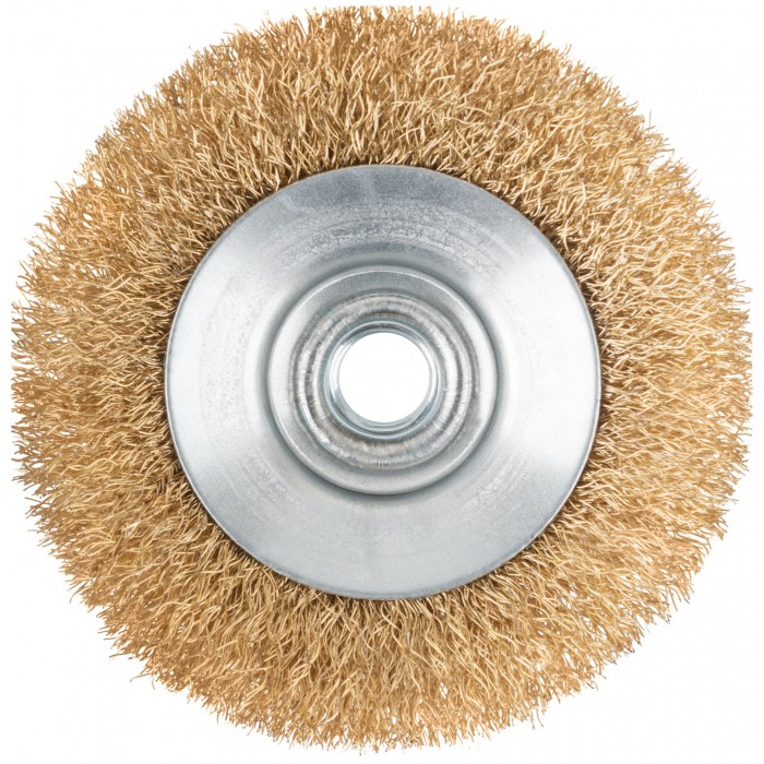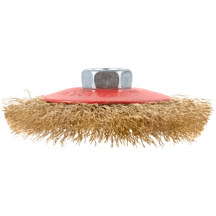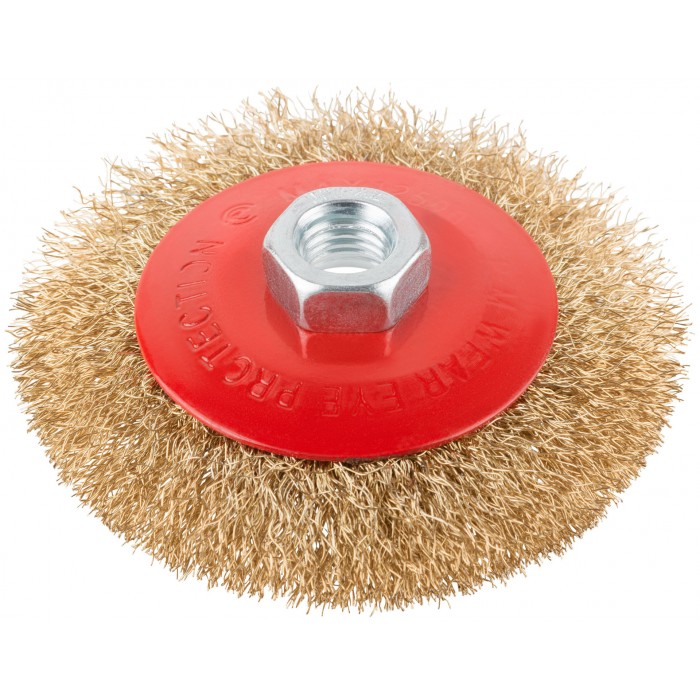 Корщетка-колесо с наклоном, гайка М14, стальная волнистая латунированная проволока 100 мм (39021)