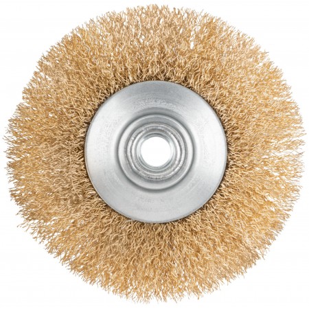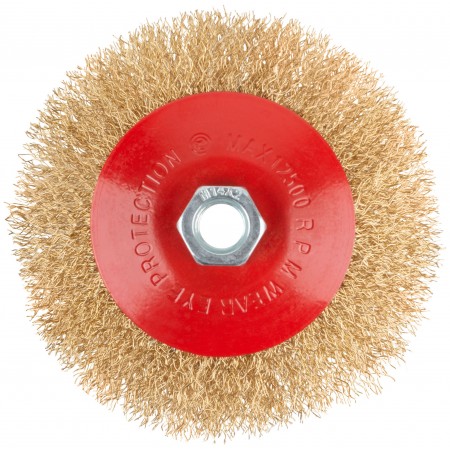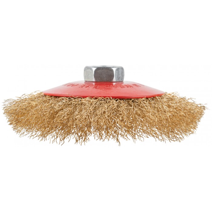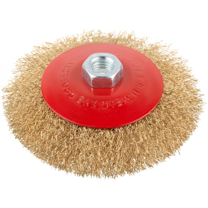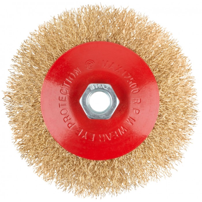 Корщетка-колесо с наклоном, гайка М14, стальная волнистая латунированная проволока 125 мм (39023)