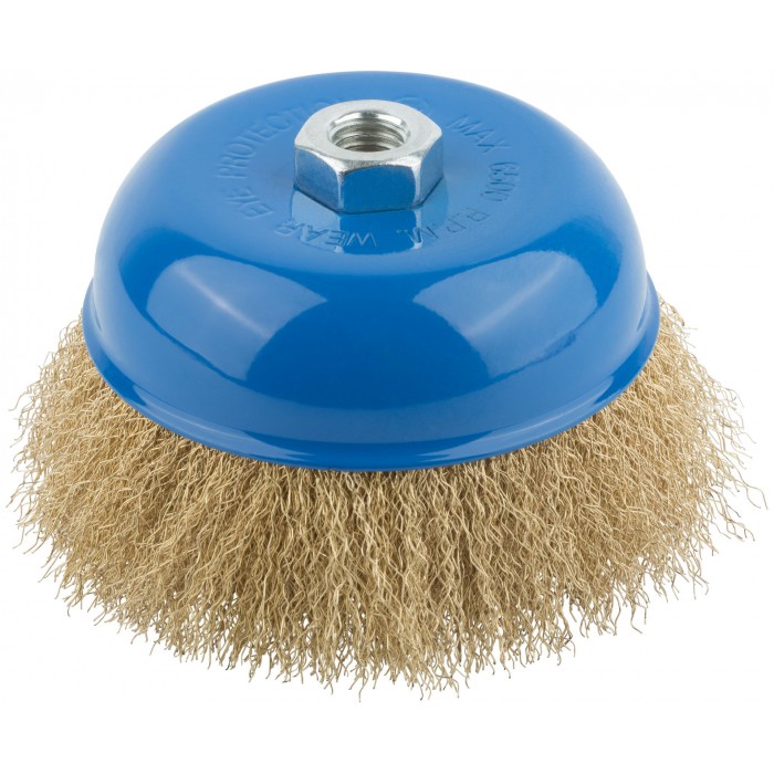 Тип «чашка». Для УШМ. Для очистки поверхностей от краски и ржавчины. Гайка М14. Латунированная волнистая проволока. Материал: инструментальная сталь. Упаковка: картонная коробка.