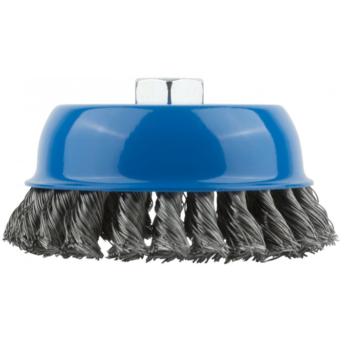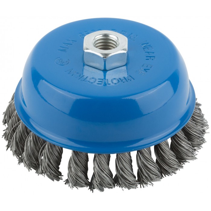 Тип «чашка». Для УШМ. Для очистки поверхностей от краски и ржавчины. Гайка М14. Витая проволока. Материал: инструментальная сталь. Упаковка: картонная коробка.