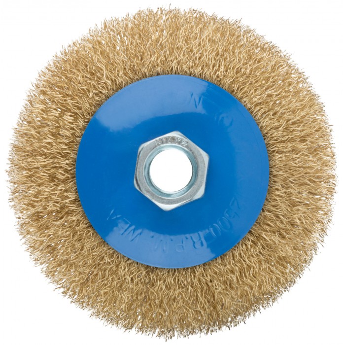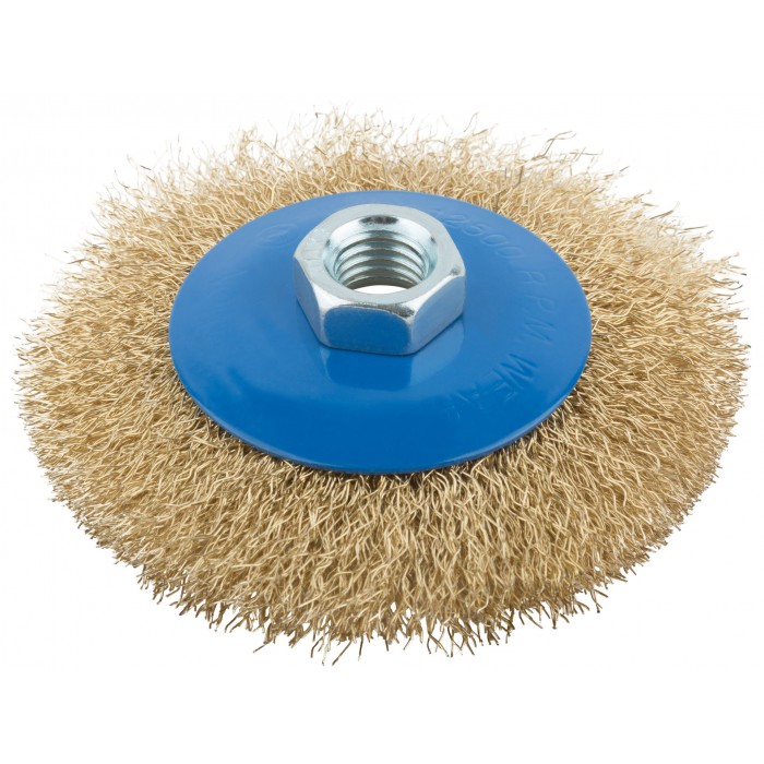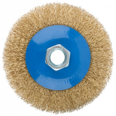 Корщетка, тип "колесо" с наклоном, гайка М14, стальная волнистая латунированная проволока 100 мм (38926М)
