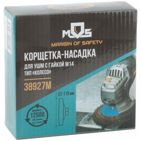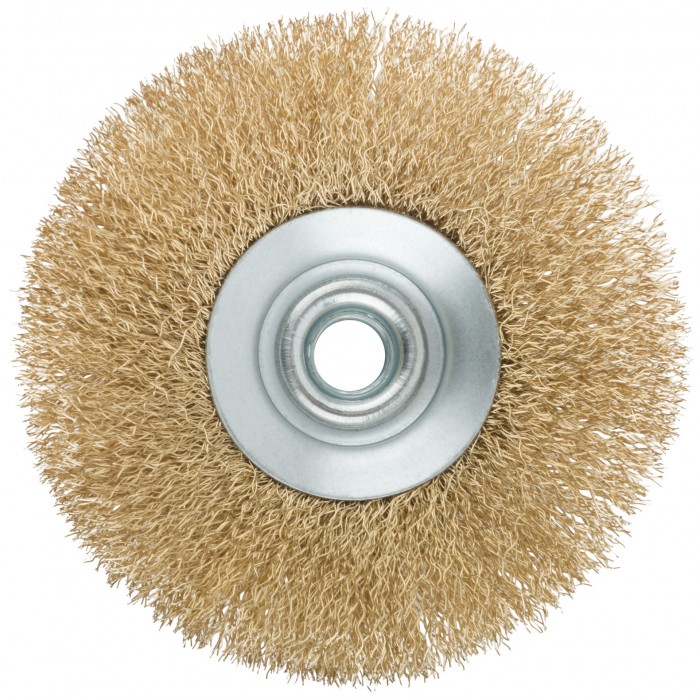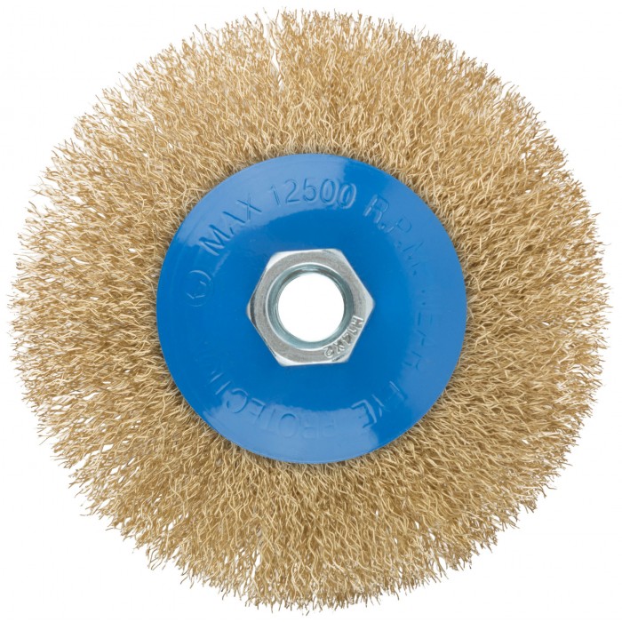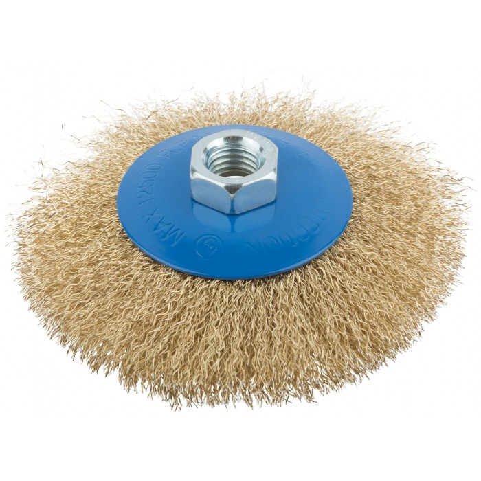 Корщетка, тип "колесо" с наклоном, гайка М14, стальная волнистая латунированная проволока 115 мм (38927М)