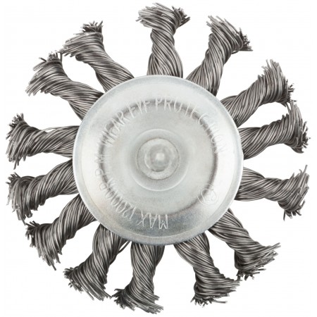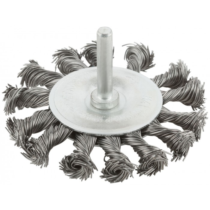 Тип «колесо». Для очистки поверхностей от краски и ржавчины. Для дрели. Со шпилькой. Витая проволока. Материал: инструментальная сталь.