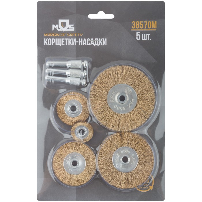 Набор 5 шт. Тип «колесо». Для очистки поверхностей от краски и ржавчины. Латунированная волнистая проволока, 3 стальных штифта для установки корщеток на дрель. Материал: инструментальная сталь. Упаковка: блистер.