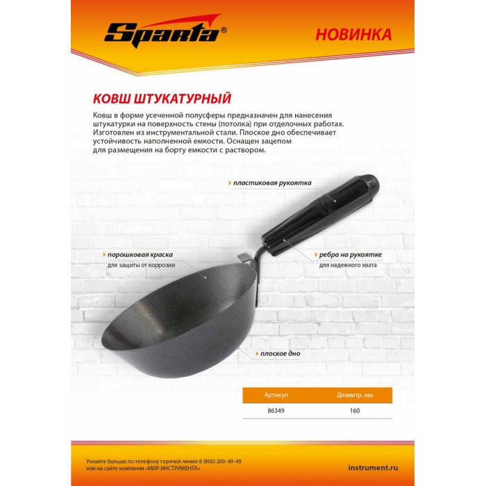 Ковш штукатурный, плоское дно, пластиковая ручка, 160мм Sparta (86349)