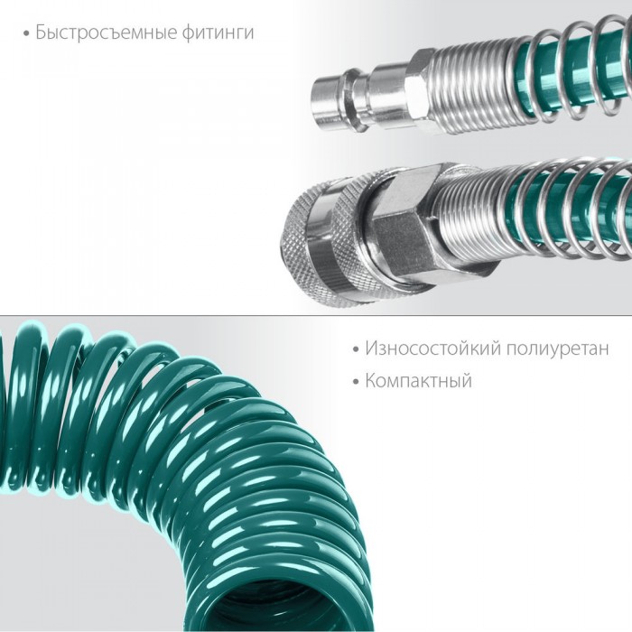 Воздушный спиральный шланг с фитингами рапид, 10 м, 8 х 12 мм, 15 бар KRAFTOOL 06590-10