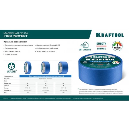 Малярная лента для гладких и шероховатых поверхностей предназначена для работы внутри помещения с большинством материалов. Стоек к УФ-лучам, влаге, температуре до +80°С, надежно приклеивается к поверхности, позволяя получившейся линии быть максимально ровной, без подтеков краски. Легко удаляется, сохраняя первоначальный вид поверхности, не оставляя после себя следов клея.