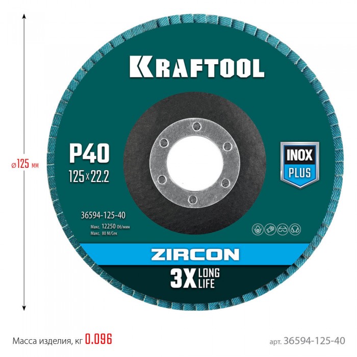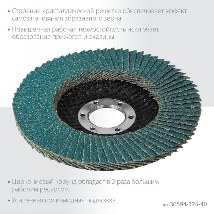 Круг лепестковый циркониевый торцевой по металлу и нержавеющей стали, 125 х 22.2 мм, P40 KRAFTOOL 36594-125-40