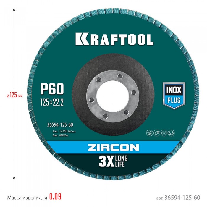 Круг лепестковый циркониевый торцевой по металлу и нержавеющей стали, 125 х 22.2 мм, P60 KRAFTOOL 36594-125-60