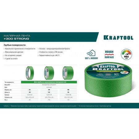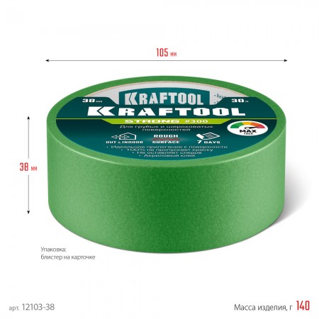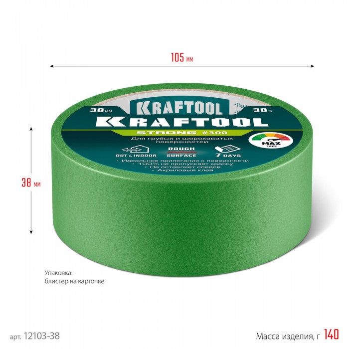 Малярная лента #300 Strong, 38 мм х 30 м, для грубых и шероховатых поверхностей KRAFTOOL 12103-38