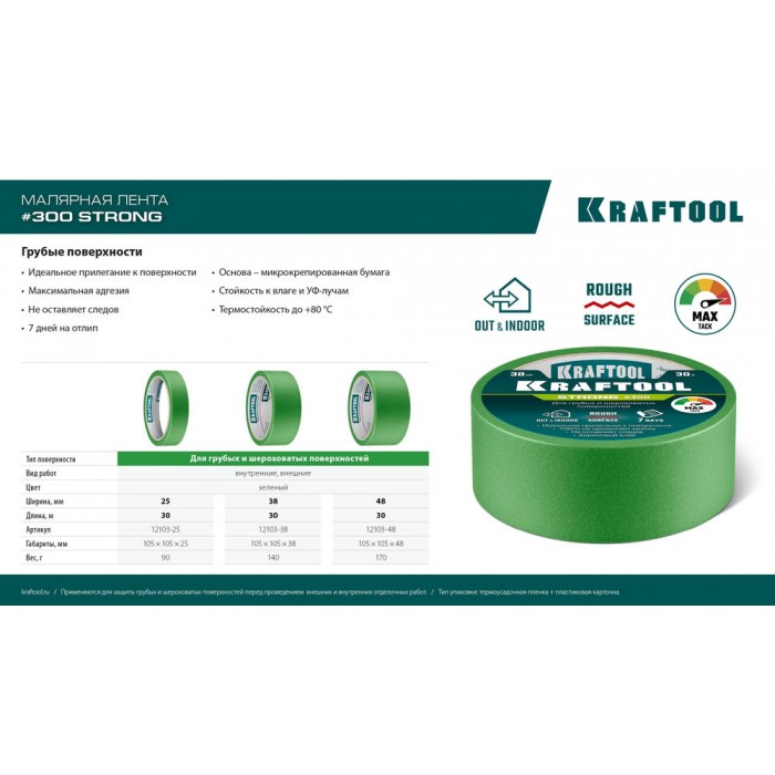 Малярная лента для грубых и шероховатых поверхностей предназначена для работы снаружи помещения с большинством материалов. Стоек к УФ-лучам, влаге, температуре до +80°С, надежно приклеивается к поверхности, позволяя получившейся линии быть максимально ровной, без подтеков краски. Легко удаляется, сохраняя первоначальный вид поверхности, не оставляя после себя следов клея.