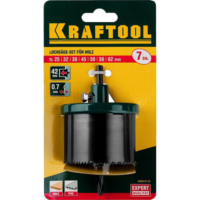 Наборная кольцевая пила по дереву, 7 шт, (25–32–38–45–50–56–62 х 42 мм) KRAFTOOL 29580-H7-42